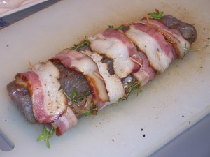 Removed skin, good idea, folded length wise and the tail in to make a log, then laid over four strips of bacon and lots of sprigs of thyme, wrapped and held with toothpicks. Seasoned with Finessence and salt.