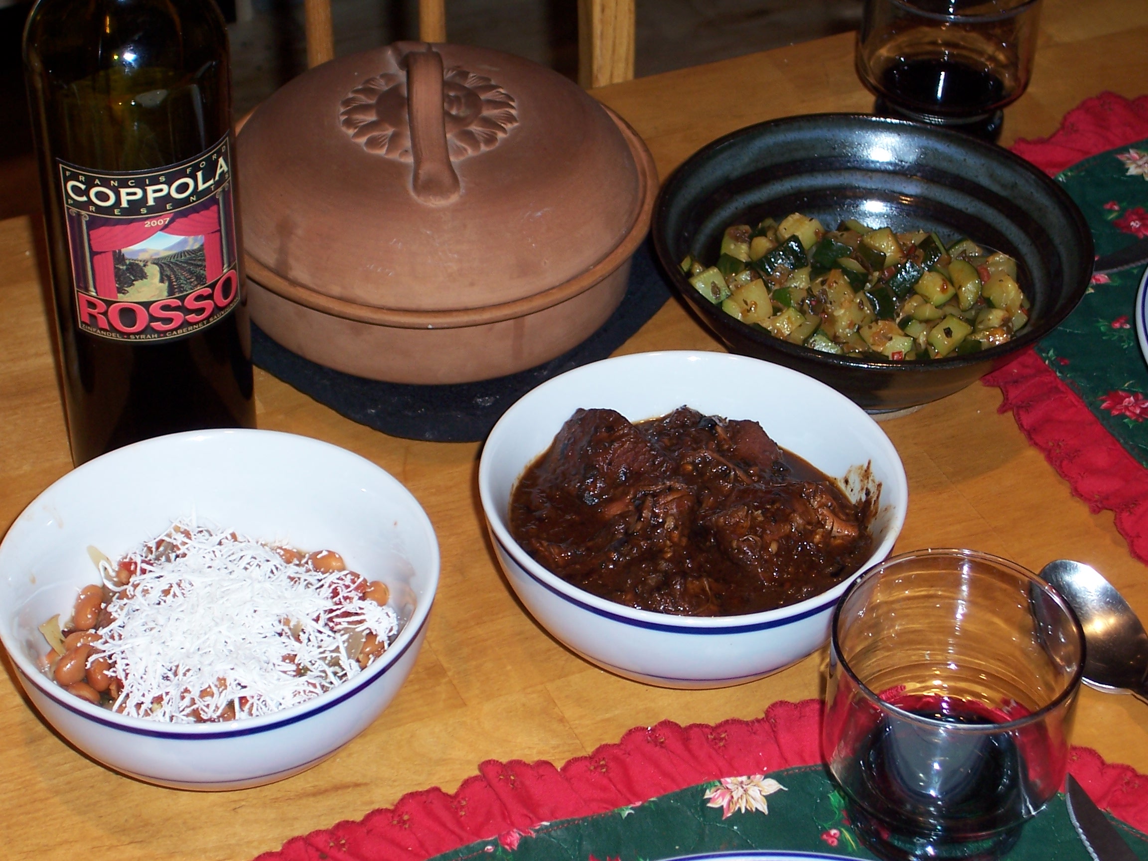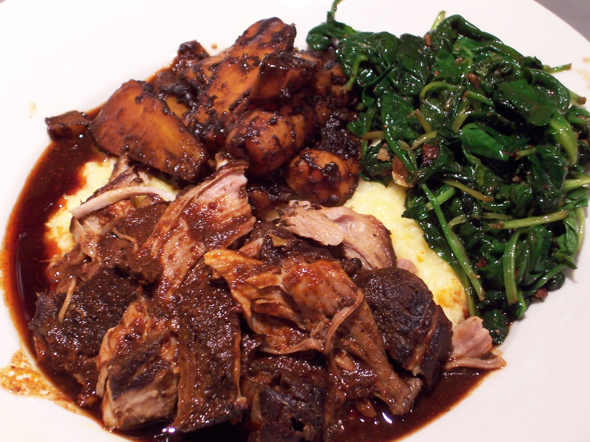 Pork was based on Saveur #76 but used a 4 1/4 pound pork butt and doubled the sauce. First made this 12/11/2005. The carrots from Border Cooking, but using Donna Maria Mole, whole baby carrots. Kathy called them, “Carrots in Mud.” But they were good. The spinach if the Rachael Ray recipe.