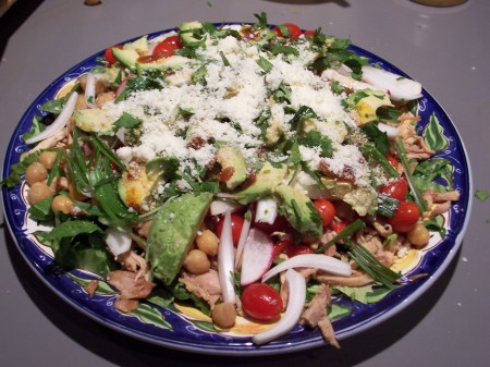 Chicken salad topped with avocado, radishes, spring Vidalias, green chilies and chipotle chilies.