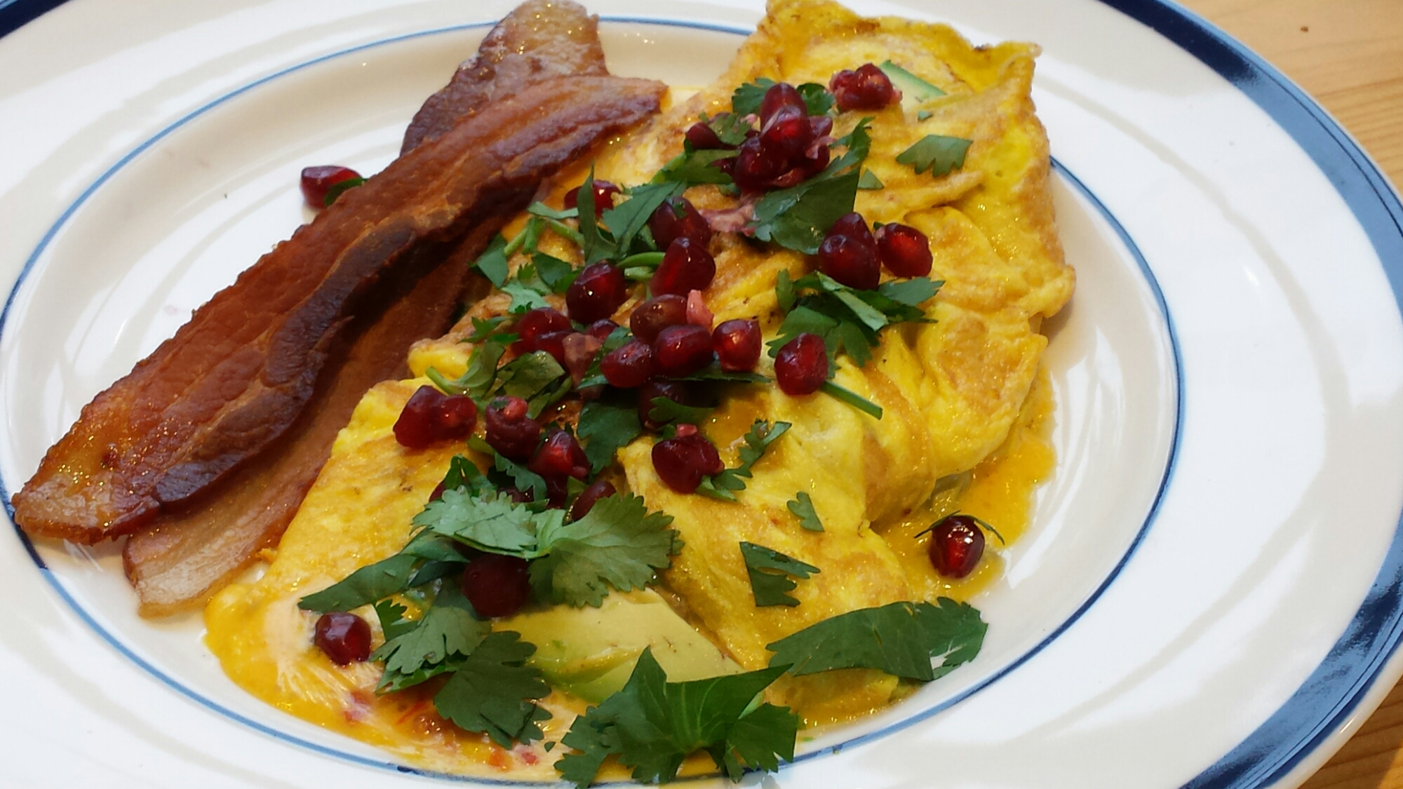 Once again I am in that Sunday morning dilemma of what to do for our omelet. I have some mushrooms, but not a cheese that inspires me or other leftovers. Humm. There is the Rotel and Velveta Queso Dip from Christmas Eve. It was a big hit with everyone but we did not finish it. And I’ve got some ripe avocados, lets do it it. Lots of queso in the center of the omelet, half a sliced avocado, fold it twice to the center and turn it on to the plate a few moments later. Topped with cilantro and pomegranate seeds. Yum!